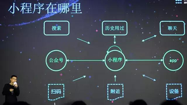 據林興介紹,小程序經過了一年多的發展,在微信中已經擴展到了50多個入口,這些入口分成三大類,線上的發現入口,線下的連接入口,以及服務與服務之間的入口。