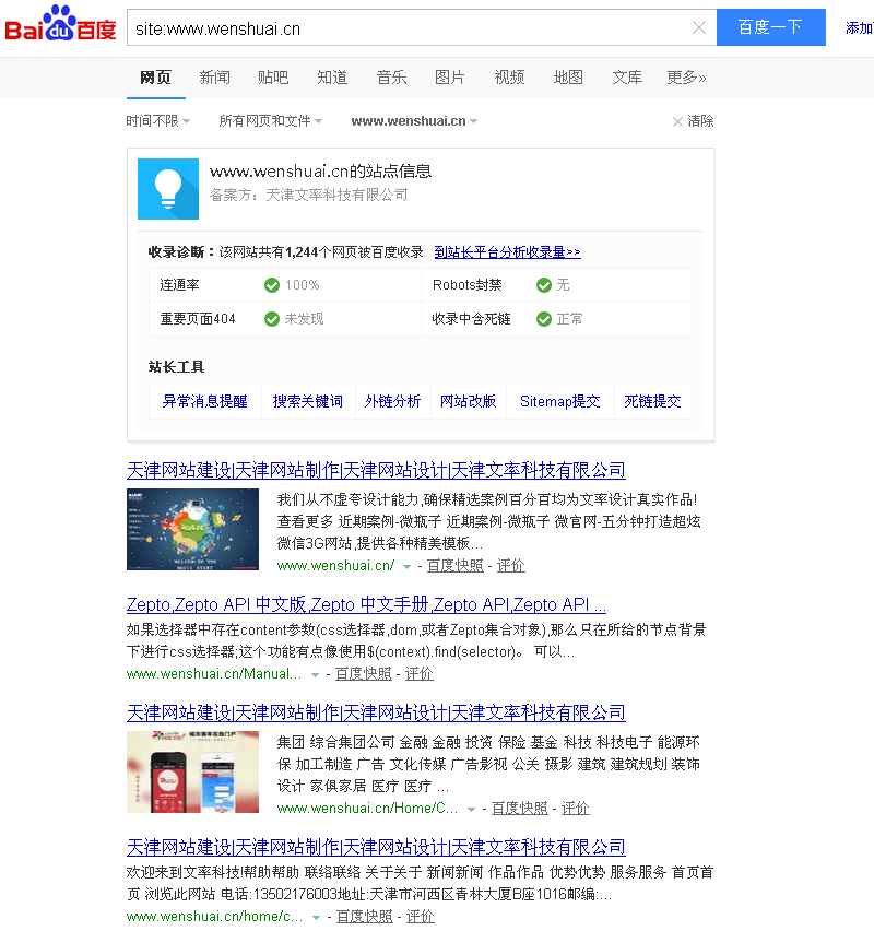 2.百度收錄:在百度里面通過指令site:就可以查詢到。通過收錄,我們可以分析出一系列的問題,如site:www.zbgxmems.com 見下圖我們可以看到文率科技的首頁在⑴位,如果不在⑴位或者收錄降了很多說明網站被降權了,這樣我們就可以通過收錄的數據,對比同等級下的兩個頁面(一個收錄了一個未收錄),找出頁面未收錄的原因,從而改進。