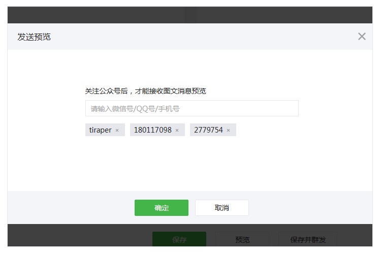 編輯圖文消息時,點擊“預覽”按鍵,除可輸入微信號發給需要預覽的微信用戶外,新增支持已綁定微信號的手機號和QQ號。