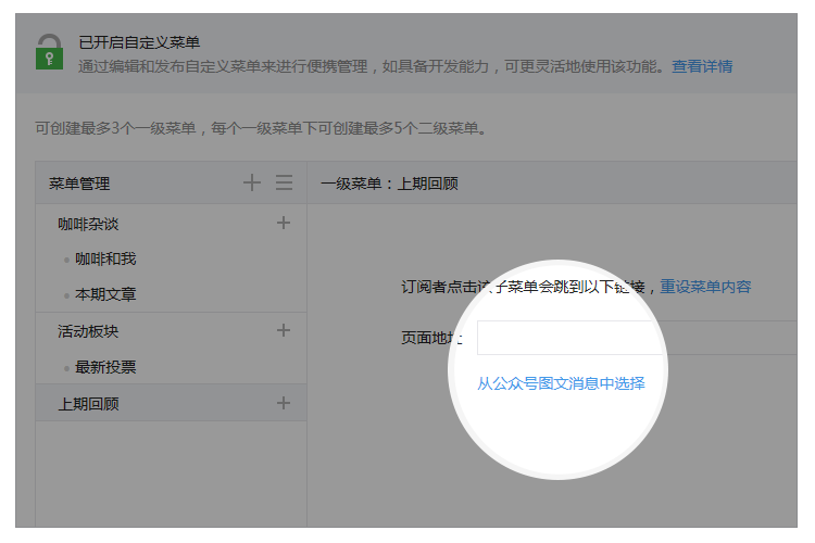 三、自定義菜單:內鏈支持歷史消息和頁面模版