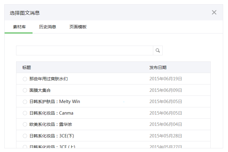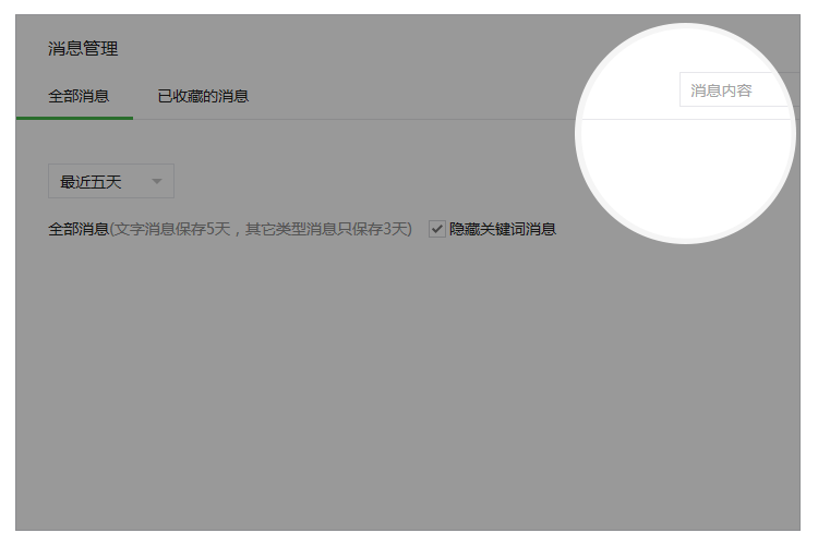 除用戶管理的搜索功能外,素材庫圖文消息和消息管理的搜索功能體驗上保持一致,輸入框內提示已支持的搜索內容。