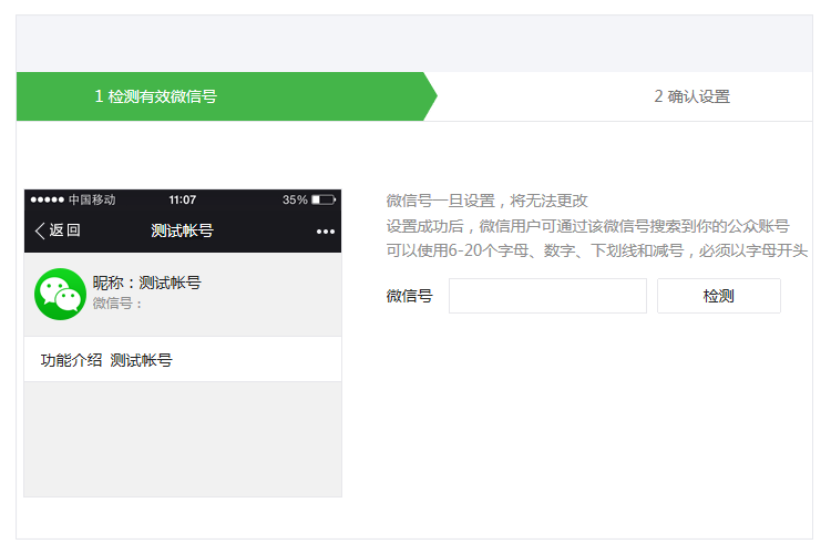 當新帳號信息審核通過后,可在“公眾號設置”進行微信號設置。運營者可先檢測預設的微信號是否可用,若可用再進行下一步操作。此外,設置微信號時,運營者直接可見微信內該公眾帳號的微信號展示效果,提升用戶對微信號的理解。