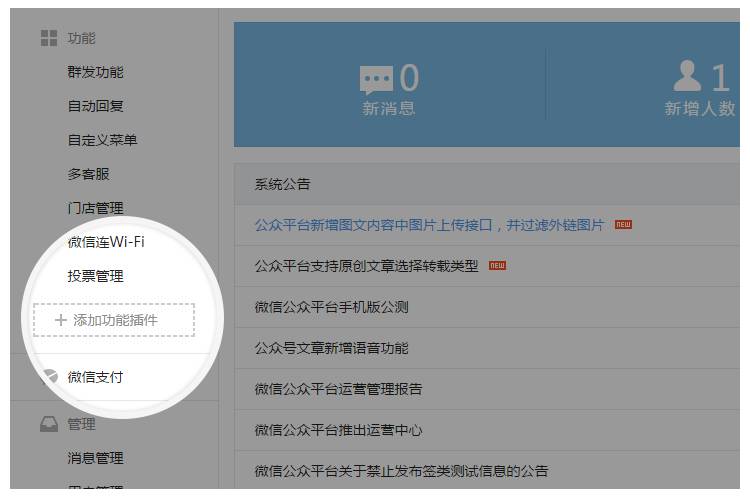 1. 運營者在功能欄目下,點擊添加功能插件。