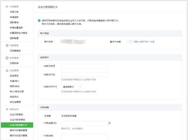 2.進入交易中心-企業付款到銀行卡頁面進行付款,API接口將在本周內逐步開放。
