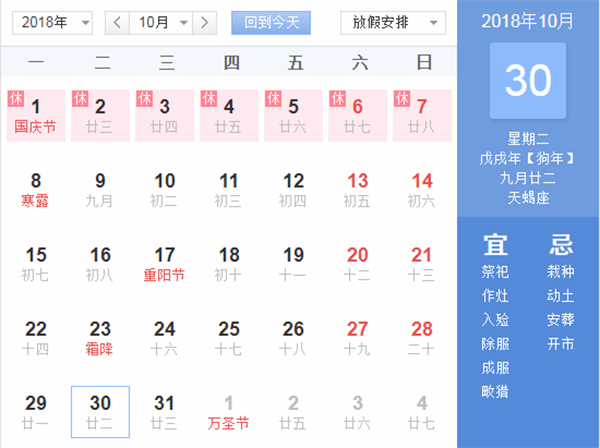 從2017年10月1日至10月7日,放假調休7天,10月8日(星期一)正常上班。9月30日周日正常上班。