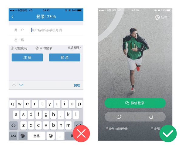 美學(xué)在設(shè)計產(chǎn)品的使用上扮演著重要的角色。美的設(shè)計能促進人們形成正面積極的態(tài)度,而且讓人們對產(chǎn)品設(shè)計上的缺陷更具有包容性。如:同樣都是登錄頁面我們更容易接受右面的設(shè)計,并且我們會通過是否美觀推斷右面的APP應(yīng)該更好用,畢竟一個好用的APP應(yīng)該都會好好“打扮”一下吧!