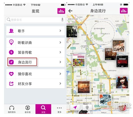 在“發現”模塊中的身邊流行功能,采用了地圖的模式。可以在地圖上顯示身邊用戶在聽的歌曲,點擊歌曲即可試聽該歌曲,不得不說這是很有意思的一個功能。