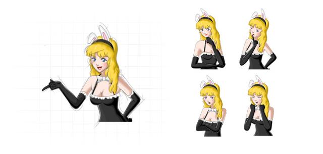 隨后考慮到形象的多場景應用問題,又增加了兔女郎俏皮、興奮、失望等表情動作。并計劃在后期的設計中增加兔女郎的人物個數,塑造3個不同性格不同風格的兔女郎形象來滿足不同用戶的喜好。