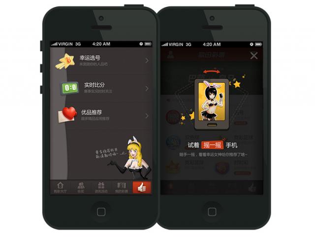 在卡通人物設計完成后,加入到了APP的推薦功能頁面設計和搖一搖幸運號頁面設計中,使頁面增色不少。我們希望通過這一系列的卡通形象包裝,讓易迅彩票APP更有趣的同時更具情感,從而間接的提升了產品的用戶粘性。