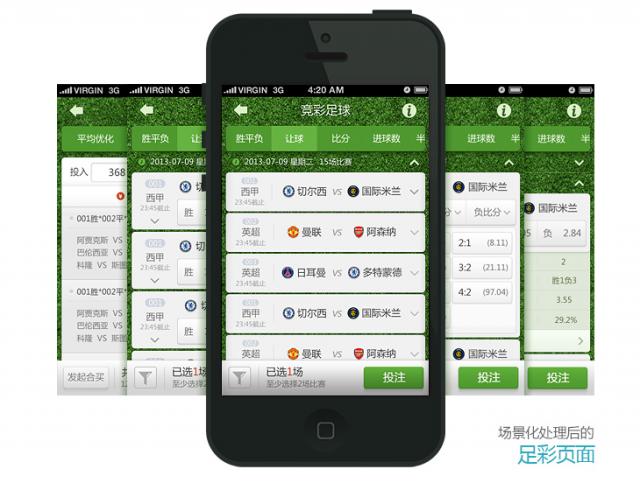 競彩足球的購彩頁面則由于展示信息量大和操作區域相對固定的原因,只能延續足球的草地場景,舍棄了其他視覺元素。盡管如此加入了足球場背景,強化了足球氛圍的頁面,更容易引起足球彩民的共鳴。