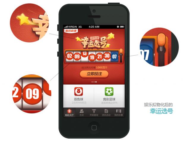 賭場中有一種拉霸抽獎的游戲機,玩家通過拉動操作桿不斷刷新屏幕上的圖案來進行抽獎。它操作簡單,玩法有趣很容易使人沉迷其中。這種拉霸抽獎的形式,非常富有隨機性,又含有博彩的寓意,操作展示形式也與隨機選號有很高契合度。因此我們將幸運選號的功能布局進行了重新設計,力求模擬成拉霸游戲機的形式來展現。用戶同樣只需要拉動操作桿,即可獲得一注雙色球號碼進行投注,整個操作流程簡單有趣。
