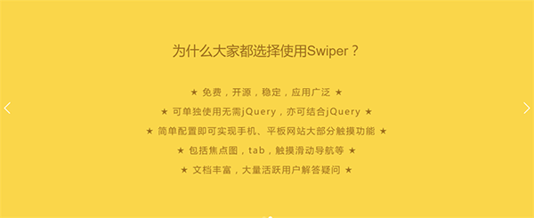Swiper是一款免費、輕量級的移動設(shè)備觸控滑塊的js框架,使用硬件加速過渡(如果該設(shè)備支持的話)。主要使用于移動端的網(wǎng)站 。其實類似這樣的滑動插件的效果庫非常多,但像他這樣,文檔能做的那么專注的就很少鳥。所以推薦推薦哦!