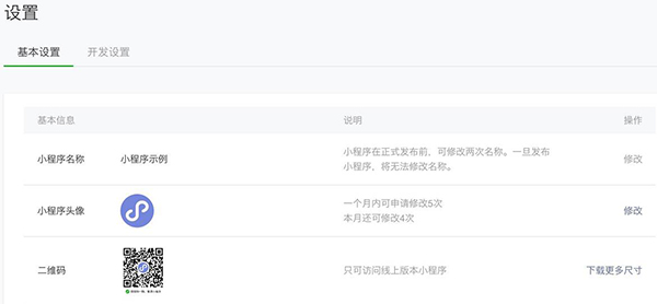1、在“設置”中查看小程序的正式二維碼,該二維碼只用于訪問小程序的線上正式版本。